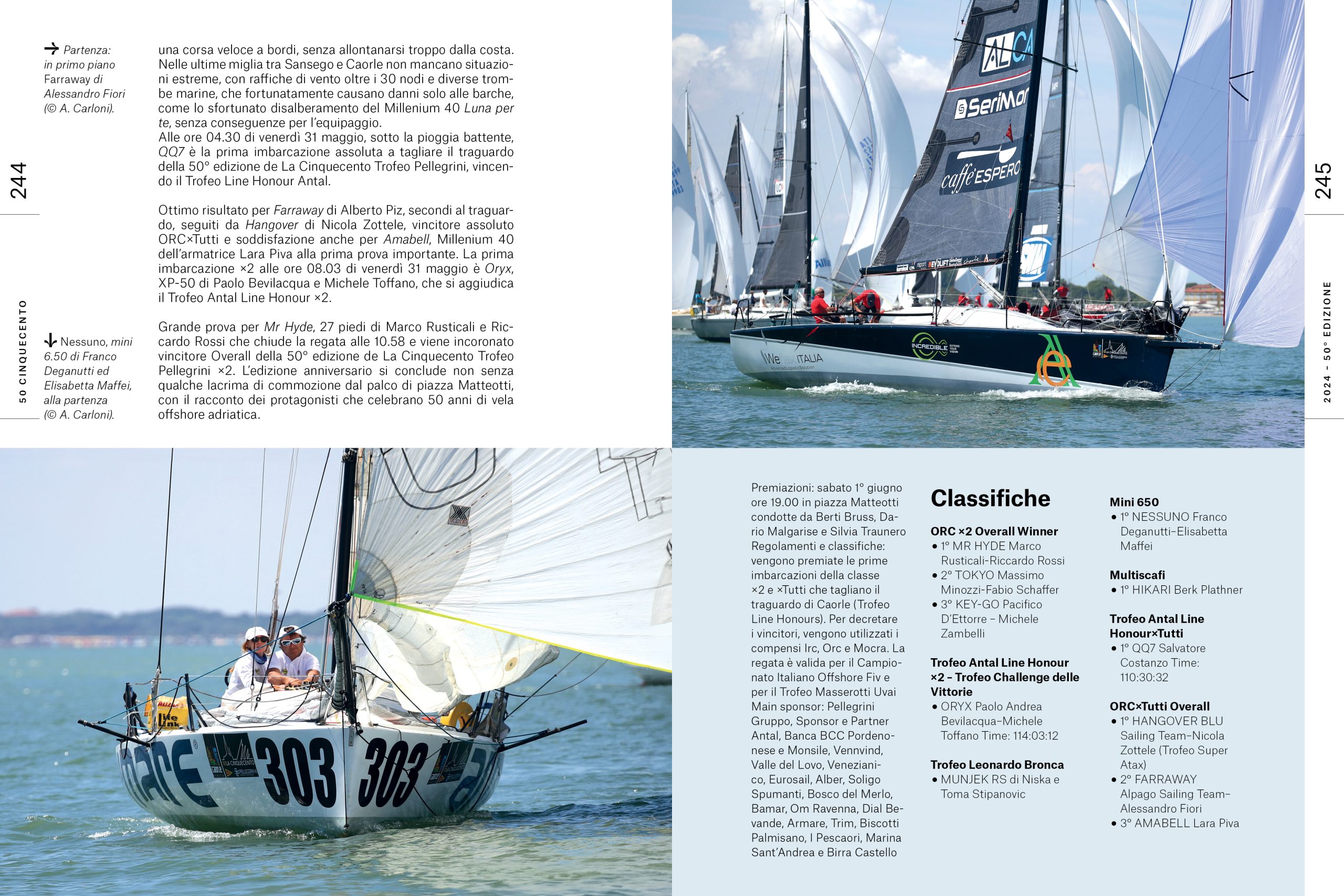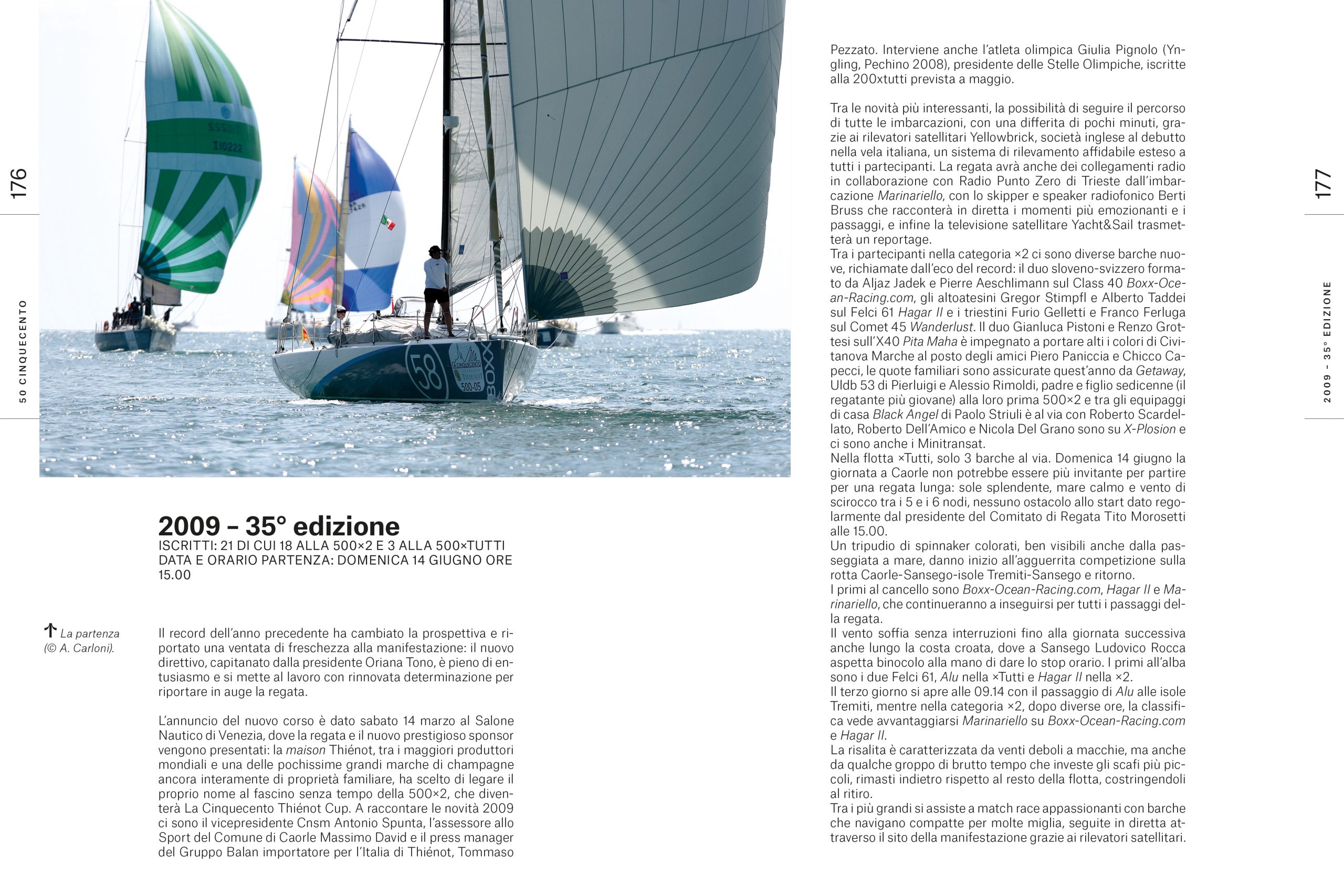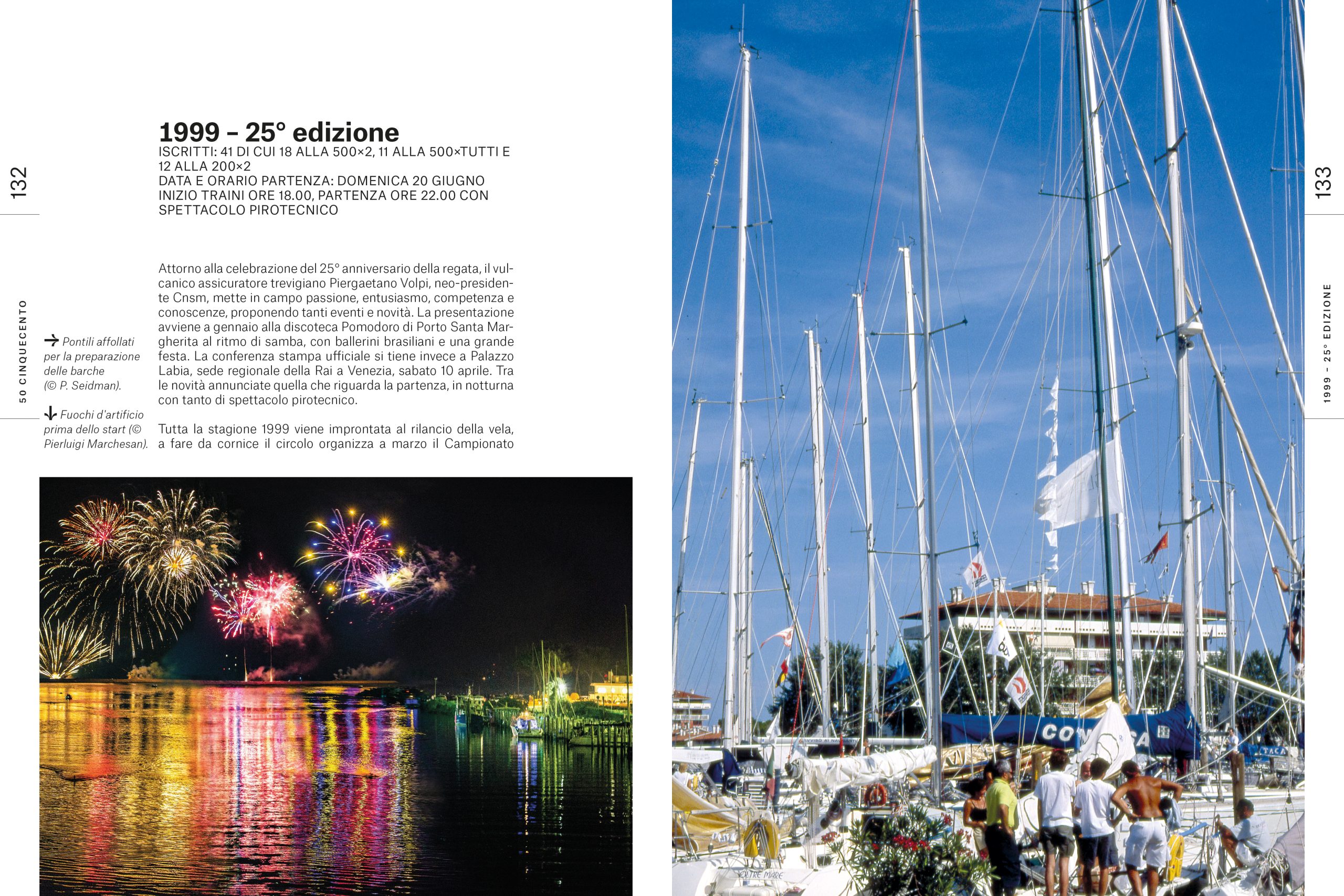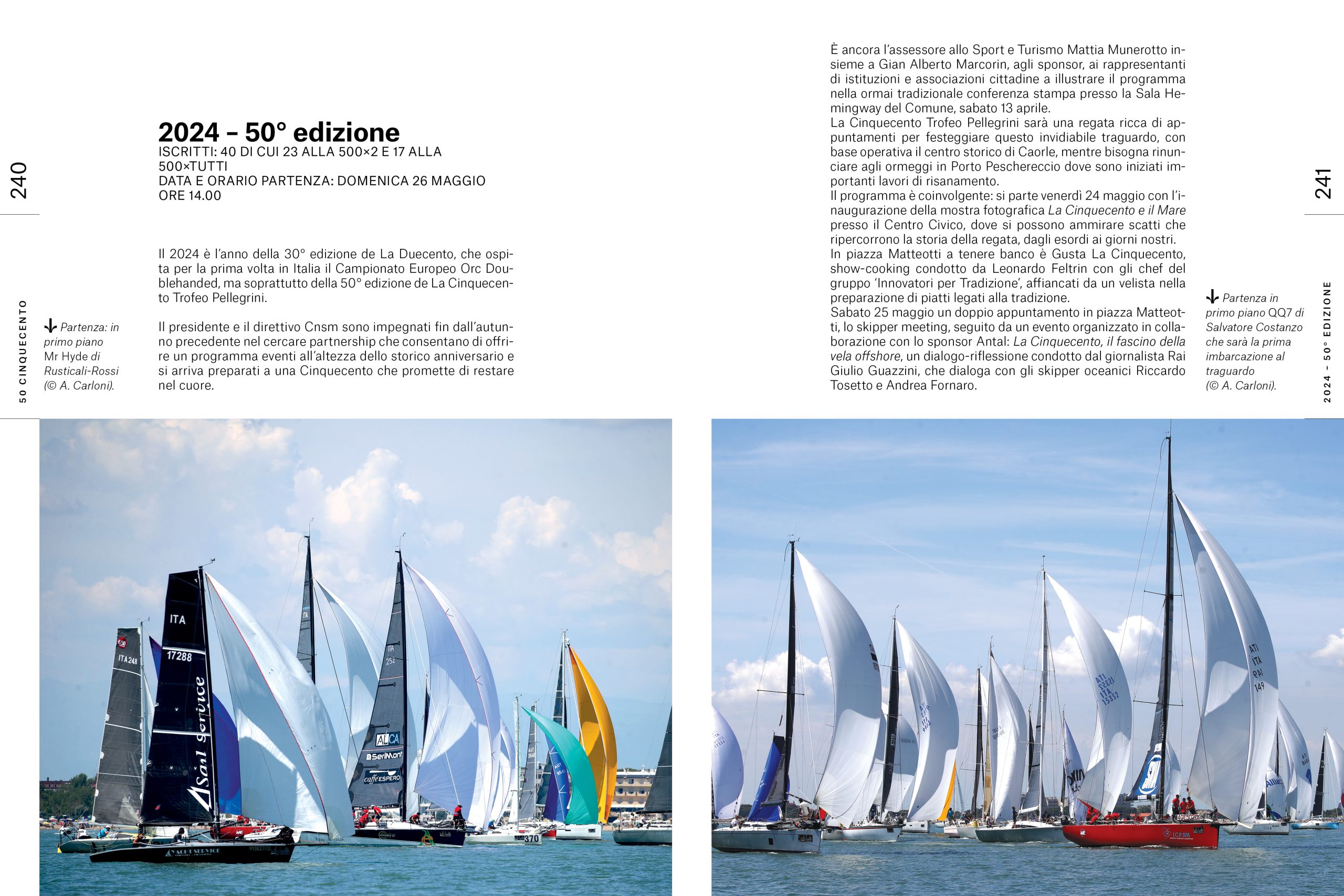 Un volume che celebra i cinquant’anni di una delle regate d’altura più classiche d’Italia, la Cinquecento. Nata nel 1974 come “500 per due”, prima regata in Mediterraneo pensata per due soli membri di equipaggio (dato che in Italia erano vietate le regate in solitaria), corre lungo un percorso no stop che parte da Caorle, a due passi da Venezia, fino alle Tremiti e ritorno lungo, per l’appunto, 500 miglia di Adriatico. Nel corso degli anni hanno partecipato alla regata migliaia di velisti, dai grandi navigatori oceanici ai regatanti e diportisti di casa nostra. Tutti con la passione della navigazione in mare aperto.
