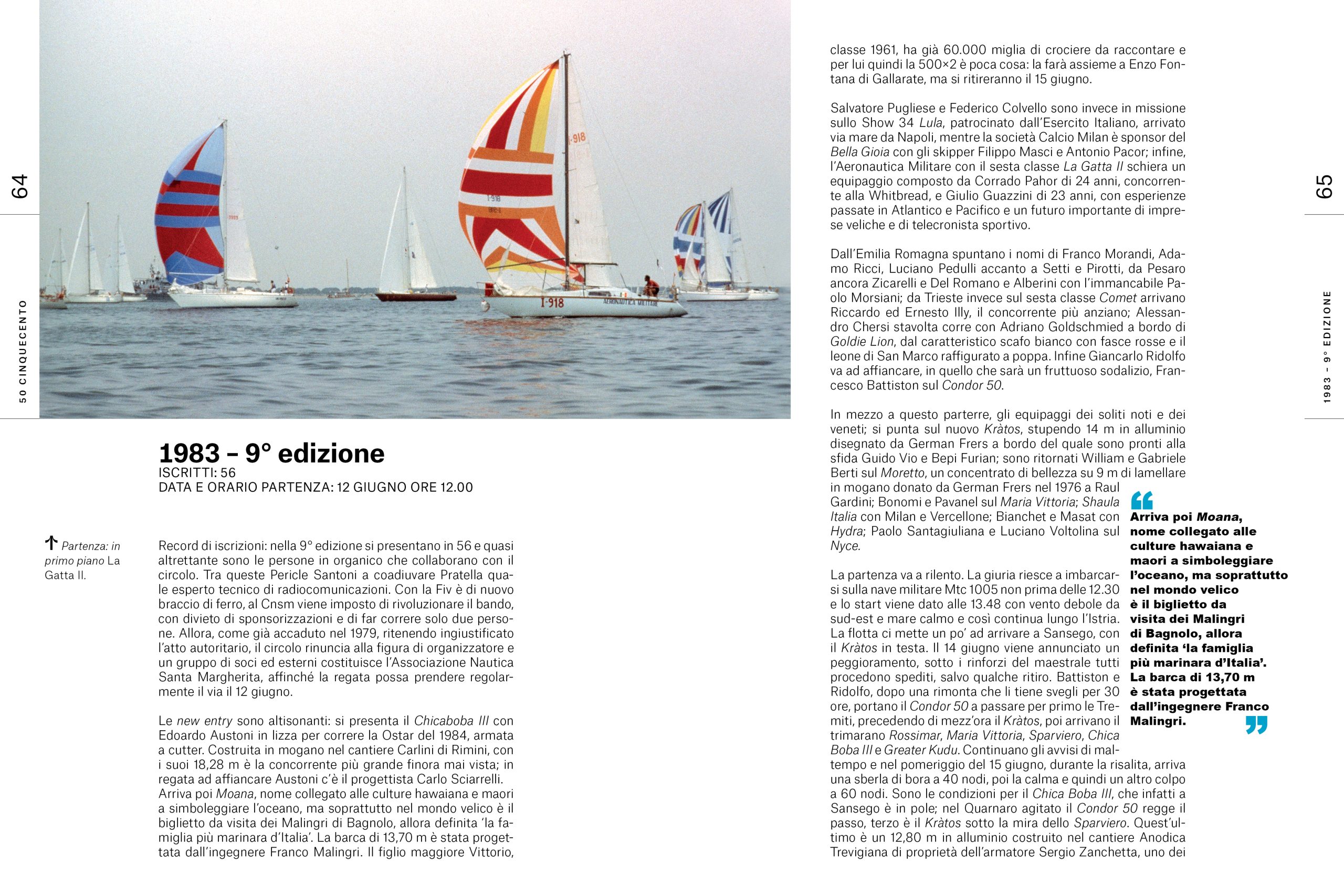 50 volte Cinquecento racconta, anno per anno, le storie, le avventure, i record della regata. Anche attraverso la voce dei protagonisti, a cominciare da Alex Carozzo, unico italiano ad aver partecipato alla mitica Golden Globe del 1968, il giro del mondo in solitaria senza scalo, e che è stato protagonista della prima edizione. Per ogni edizione saranno riportate tutte le classifiche, ma anche i nomi e le caratteristiche di tutte le barche partecipanti.